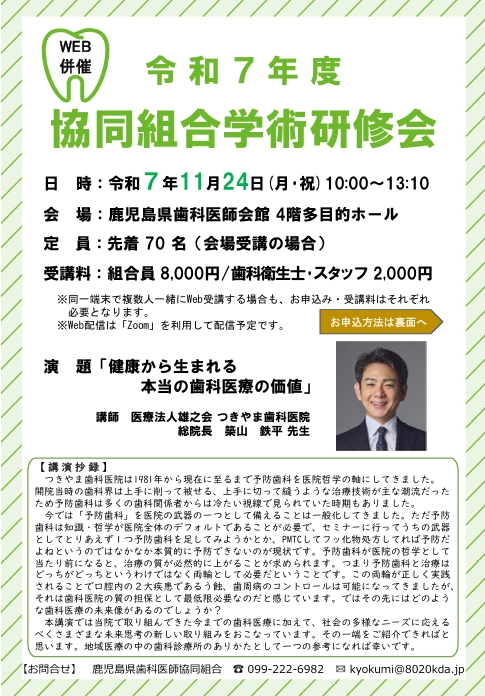 今年度も歯科医師協同組合主催・鹿児島県歯科衛生士会共催の協同組合学術研修会を開催いたします。