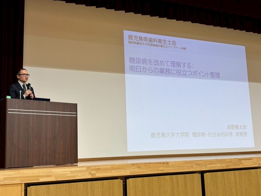講演1では、鹿児島大学 糖尿病・内分泌内科学 准教授 森野 勝太郎 先生をお招きし、「糖尿病を改めて理解する:明日からの業務に役立つポイント整理」と題し、糖尿病の基礎知識から病態まで詳しくご説明いただき、「歯科受診・メンテナンスの継続が血糖コントロールやQOLの向上に関与する」という明確なメッセージが、受講者の現場でのモチベーション向上につながる内容でした。