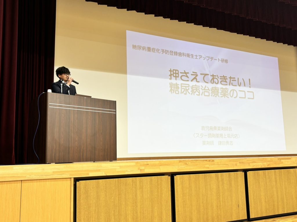 講演2では、鹿児島県薬剤師会 薬剤師 鎌田 貴志 先生より、「押さえておきたい!糖尿病治療薬のココ」とのご講演をいただき、歯科衛生士が理解しておきたい糖尿病治療薬に関する知識をご教示いただき、患者さんが服用している治療薬から歯科衛生士がみるポイント、気をつけるべきポイントなどを薬剤別にお教えいただきました。糖尿病治療薬の歴史から現在の治療薬に至るまでを大変わかりやすくご解説いただき、なぜ現在この薬剤が用いられているのか、また、なぜ使用されなくなった薬剤があるのかについて、深く理解することができました。