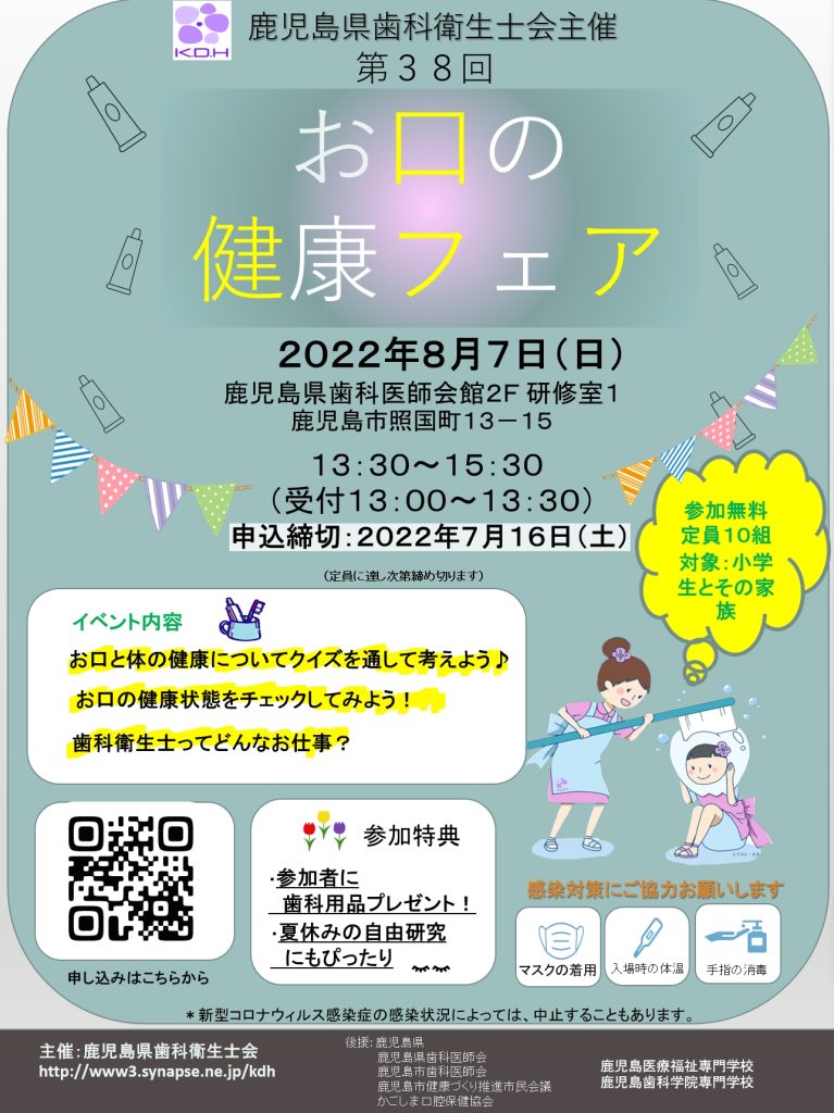 毎年8月に鹿児島県歯科衛生士会主催イベント「お口の健康フェア」が開催されます。県民のお口の健康づくりを推進するため、むし歯や歯周病等の歯科疾患予防に関する知識や、正しい歯磨き方法等について普及啓発を行い、県民の健康の保持増進に寄与することを目的としています。